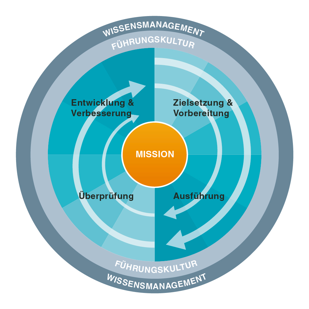 Wir setzen uns Unternehmensziele auf dem Weg zum nachhaltigen Erfolg (Mission). Daraus werden für jede Abteilung lokale Ziele abgeleitet, die das Erreichen dieser Unternehmensziele ermöglichen. Die Abteilungen planen ihre Prozesse entsprechend ihrer gesetzten Ziele.