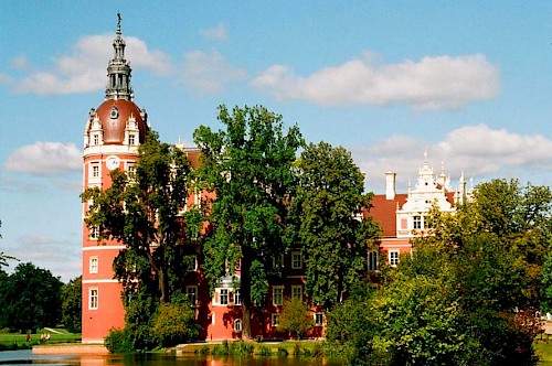 Das Schloss wird erstmals im 13. Jh. als Befestigungsanlage an der Neiße erwähnt. Den Park legte Fürst Hermann von Pückler-Muskau an. Inspiriert von den englischen Landschaftsgärten, gestaltete er das Anwesen zwischen 1815 und 1845 in einen riesigen Landschaftspark um. Im 2. Weltkrieg wurden Schloss und Park stark in Mitleidenschaft gezogen. 1945, als die Neiße zur deutsch-polnischen Grenze wurde, wurde auch der Park geteilt. Die Verwaltungen auf beiden Seiten arbeiten heute eng zusammen, um die 830 ha große Anlage endgültig wiederherzustellen. Seit 2004 gehören Park und Schloss zum UNESCO Welterbe.