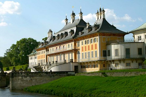 Schloss Pillnitz, ein Barockschloss an der Elbe im Osten Dresdens, diente von 1694 bis 1918 als Sommerresidenz der sächsischen Fürsten. 1720 wurde es auf Anordnung von August II zu einem orientalischen Sommersitz im Stil der damals sehr beliebten „Chinamode“ umgebaut. Neben weiteren Gebäuden entstand auch ein Anlegesteg für die königlichen Gondeln. Das Schloss ist von einem großen Park umgeben mit einem englischen und chinesischen Garten. Zweifellos die größte botanische Attraktion ist die 1776 aus Japan eingeführte, inzwischen ca. 9 m hohe Kamelie, die jedes Frühjahr ca. 35000 Blüten treibt. Schloss und Park können besichtigt werden.
