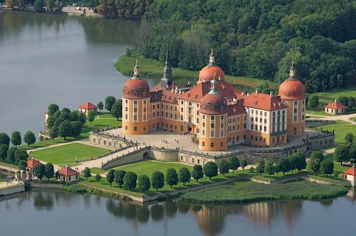 Schloss Moritzburg, benannt nach Herzog Moritz von Sachsen, der anordnete in seinem bevorzugten Jagdgebiet unweit der Residenz Dresden ein Jagdschloss zu errichten, das 1542-46 im Renaissancestil auf einer künstlichen Insel erbaut wurde. August II entschied, das Renaissancegebäude in ein barockes Jagd- und Lustschloss umzuwandeln. Während des Umbaus 1723-33 entstanden ein Park, mehrere Teiche, ein Wildgehege und das Fasanenschlösschen. Sein Urgroßenkel erweitere das Anwesen 1770-76 durch Wohn- und Wirtschaftsgebäude sowie einen Miniaturhafen auf dem großen Teich. Der letzte Schlossbewohner (1933-45) war Prinz Ernst Heinrich von Sachsen, der das Schloss bis zur Enteignung der Wettiner nutzte. Schloss und Park sind heute ein Museum.