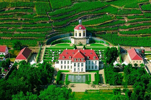 Schloss Wackerbarth liegt im Elbtal, dem kleinsten Weinanbaugebiet Deutschlands, wo für den Weinanbau günstige klimatische Bedingungen herrschen. Graf von Wackerbarth ließ das nach ihm benannte Schloss 1727/28 im Barockstil als seinen Alterssitz erbauen. Nach seinem plötzlichen Tod wechselte das Anwesen häufig den Besitzer. Seit 1928 ist es in Staatsbesitz. Heute wird es von der Sächsischen Staatsweingut Schloss Wackerbarth GmbH betrieben. 2001-02 entstand eine transparente Wein- und Sektmanufaktur. Das Weingut ist zur Besichtigung, für Weinproben und andere Veranstaltungen geöffnet.